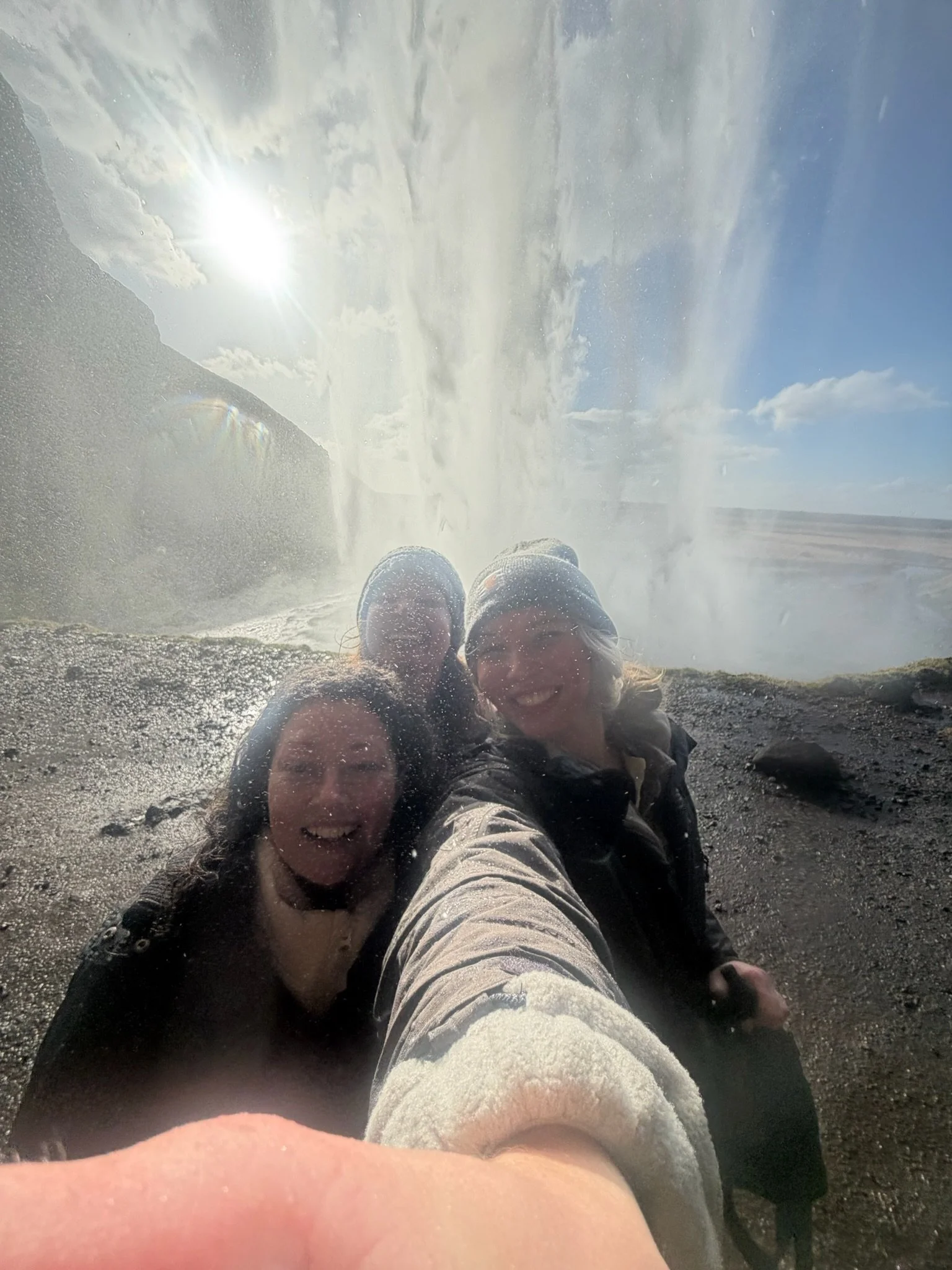 There is a word I keep coming back to: euphoric. Not happiness, not joy — euphoric. The specific kind of altered state that comes from standing close enough to Seljalandsfoss that the spray soaks through your jacket and the roar fills every crevice of your mind until there is simply no room left for worry. As we walked the path behind the falls, the mist caught the gorgeous sunlight and scattered it into raibows. The were so plentiful that in my deliriously giddy state of euphoria I said to my sister, “I have rainbows in my eyes!” The ozone-clean air arrived in waves. There is actual science behind why waterfalls make us feel high: negative ions released by crashing water are believed to increase serotonin levels. I believe it completely. I felt it in my bones. But more than the chemistry, it was the scale of it — the reminder that you are small and the world is magnificent and neither of those things is a problem